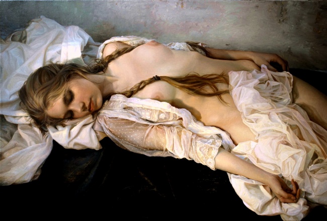 Героинями его полотен становятся нежные и беззащитные в своей полуобнаженности женщины. Утонченные и одухотворенные, они воплощают собой всю чувственность и неповторимость русской красавицы, любимой женщины, которую хочеться пробуждать поцелуем, кутать в шелка и меха, носить на руках.