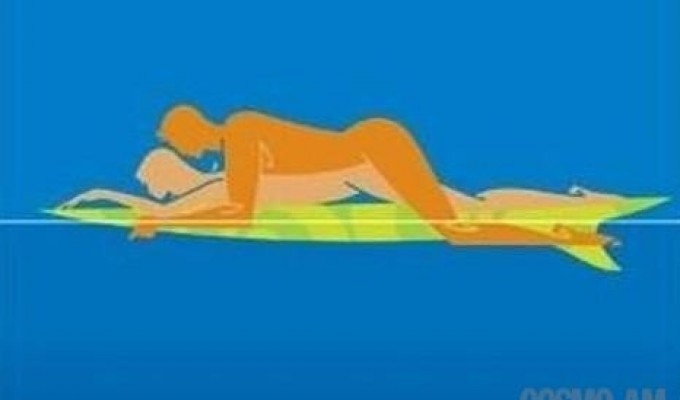 Էրոտիկ ցուցումներ: Սա մի փոքր խրթին դիրք է և հնարավոր է իրականացել միայն այն ժամանակ, երբ ծովը խաղաղ է: Դեմքով պառկիր սերֆինգի տախտակի վրա` ձեռքերդ ու ոտքերդ պարզած դիրքով: Կողակցիդ խնդրիր կանգնել կողքիդ` մինչև գոտկատեղը հասնող ջրում: Այնուհետև թող նա ոտքը անցկացնի տախտակի վրայով այնպես, ասես ձի է հեծնում և ներս մտնի հետևի կողմից: Երբ նա և տախտակը հաստատուն կլինեն, թող սիրելիդ նույնպես ձեռքերն ու ոտքերը պարզի: