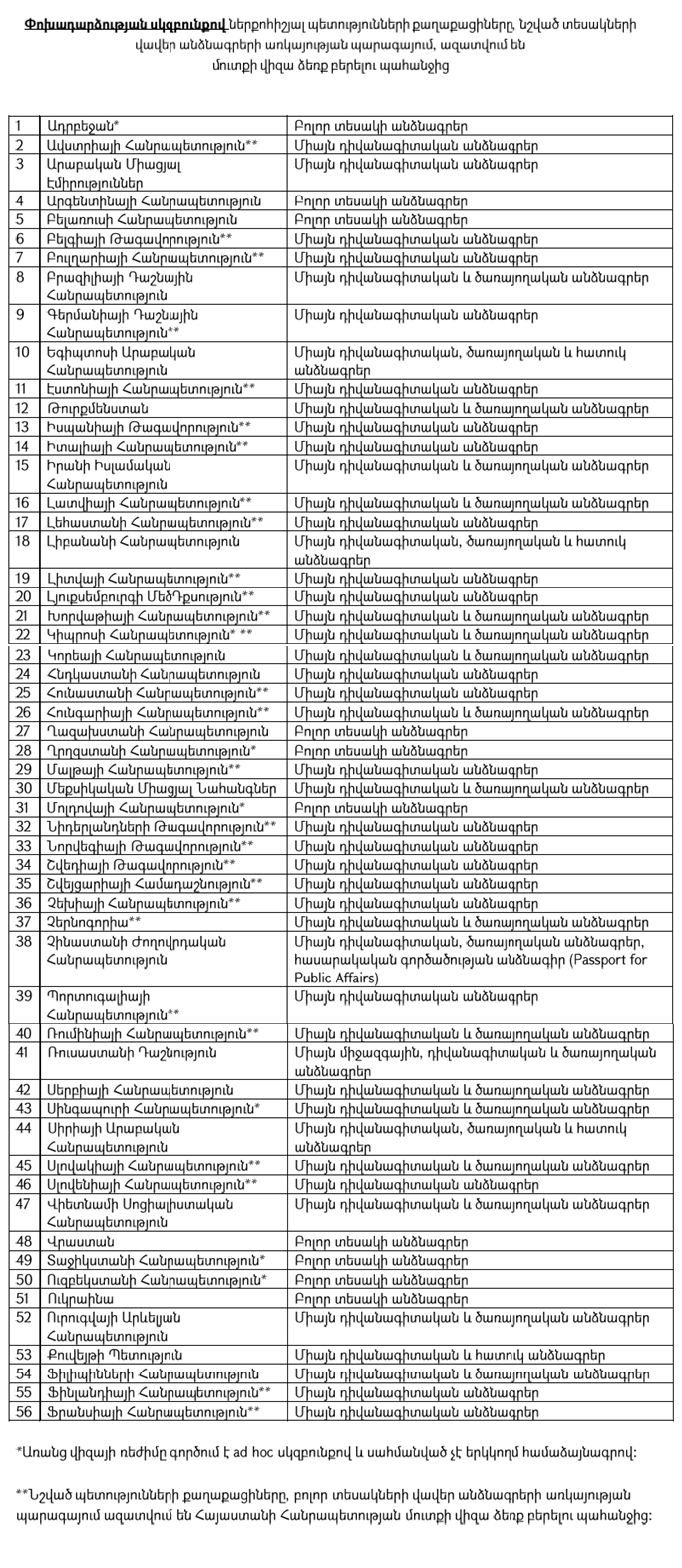 Մնացած բոլոր պետությունների քաղաքացիները, անկախ անձնագրի տեսակից (դիվանագիտական, ծառայողական, համաքաղաքացիական կամ ճամփորդական փաստաթուղթ), ինչպես նաև ՄԱԿ-ի անցագիր (Laissez-Passer) կրողները, չեն ազատվում ՀՀ մուտքի վիզա ստանալու պահանջից: