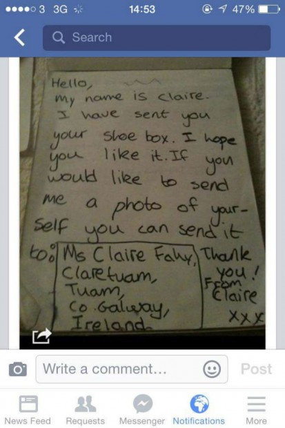 Իռլանդուհին ապշել է, երբ անծանոթը, որին նա 16 տարի առաջ նվերներով արկղ է ուղարկել, Facebook սոցցանցում գտել է իրեն: Ըստ «Irish Daily Mirror»-ի, Տուամ քաղաքի 24-ամյա բնակչուհի Քլեր Ֆեհին ցնցվել է, երբ Արսեն Խաչատրյանից նամակ է ստացել: